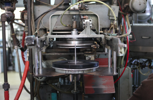 Each stamper,which is attached to an autonomous 100 tonne hydraulic press,works essentially like a waffle iron and can churn out 1,000's of records before needing replacement.A sheet of pre-heated vinyl roughly half the area but 3 times the thickness of a finished disc,known as the biscuit,is slipped between the jaws of the press,300 degree steam is then applied to further soften the material before the jaws close,and squeeze the hot vinyl into it's final shape while imprinting the audio.The disc is then cooled and hardened in a water bath and then labelled - all of which is done automatically.