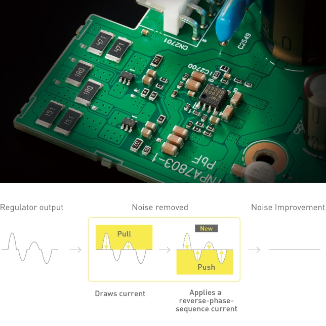 Digital audio players that handle small signals require thorough noise suppression because even the slightest noise can significantly affect sound quality. The Multi-Stage Silent Power Supply provides thorough noise suppression in three stages: (1) High-speed switching power supply, (2) low-noise regulator, and (3) current injection active noise cancelling.
